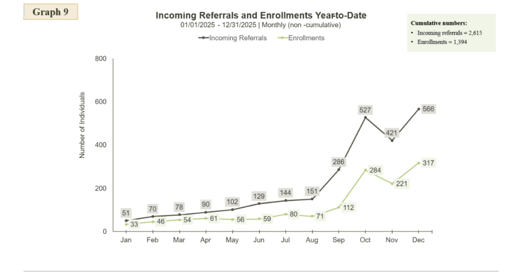 An area of improvement for Olympic Connect is to understand why some community members start the process to establish with Olympic Connect but don’t officially enroll in the service. For 2025, the total referrals received were 2,615 and the total enrollments were 1,394.