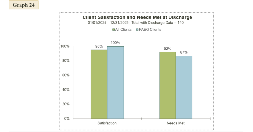 Needs met at discharge: Similarly, both the general population and the Prime Age Employment group population report that the majority of their needs are met when they are discharged from Olympic Connect. Olympic Connect care coordinators (trusted helpers) are effectively helping clients get connected to the services and care they need to thrive.
