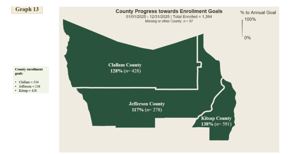 Partners contributing to Olympic Connect made great progress toward enrollment goals this year. Each county in the Olympic region surpassed its enrollment goal. More individuals were enrolled in Olympic Connect in 2025 than planned, and that number continues to grow already in 2026.